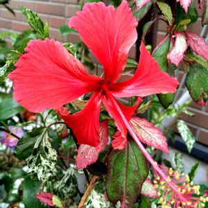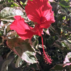 冬の間はたまーにしか咲いてくれなかった、斑入り葉のハイビスカス・スノーフレークさんも、久々に咲いてくれました。お花は原種に近い小輪の赤花で、こういうのも好みなんです♪(豪華なフリフリの大輪も好きですが^^;)そろそろ外に出そうと思ったら急に寒さがぶりかえしたので、もうしばらくうちにいてもらいます💦