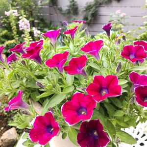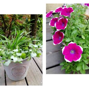 ❤️サフィニアアートのあずきフラッペ🍧も咲きたいのに何度も雨に濡れて、ずっとくすんだ色でしたがやっと、少し咲きそろいました😄❤️ アズーロコンパクト🤍スノー・ホワイト・スノーは植えつけてすぐに、ヒヨドリにど真ん中の茎を突かれて割れているので、真ん中がなかなか咲いてきませんが頑張って手を広げるように広がって咲いてます🤍💚 どちらもそろそろカットした方がいいのですが、もう少し楽しみます😉