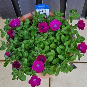 サントリーフラワーズ サフィニアアートあずきフラッペ 3月12日(水)にお迎えしました🗓️ 前回の投稿が5月1日(木)📆 株が大きくなりすぎて😅花数が増えたことが分かりにくいです😵💦 この咲き方を見ると以前に地植えしたペチュニアを思い出します😊 この子のサフィニア独特のベタベタ感が凄いです😅