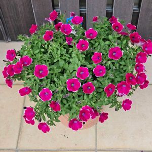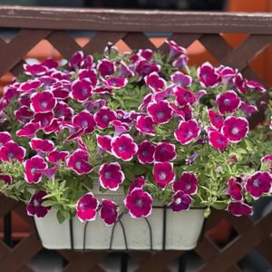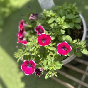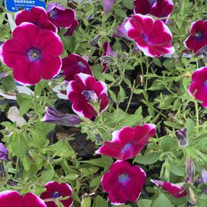 🍀🌻🪴💐🌹🌻🍀 🍀🩷サフィニアアート あずき フラッペ🩷🍀 今年新たにお迎えしました、あずき色が素敵です 💐サフィニアアートあずき フラッペ の花言葉は(心のやすらぎ)です 💐ナス科ツクバネアサガオ属、ペチ ュニア属の植物です 💐サフィニアはペチュニアの品種改 良植物で、花自体のサイズ感は小 ぶりですが全体感にボリュームが あり、春から秋まで長くたくさん 花をつけます 💐あずき色に白い縁取りのあずき フラッペ(かき氷)に似ていること から名前が付きました 🍀🌻🪴💐🌹🌻🍀
