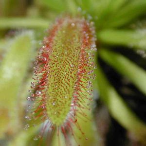 【モウセンゴケ(ドロセラ)】 食虫植物の一種で、葉にある粘毛から粘液を分泌して虫を捕獲する。 葉のまわりにはスラリと伸びた腺毛がいくつも生え、それぞれの先端に粘液の雫がキラキラと光る。 北九州市総合農事センターにて