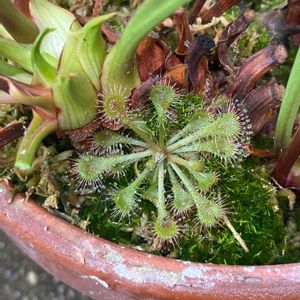 今日も寒いですね。 明日も10℃ですって。 週末になると寒くなるのは本当に辞めて欲しいです😣 モウセンゴケことドロセラちゃんは、どんどん上に伸びてわさびみたいになるので、そろそろ植替えをしようとHCに水苔を買いに出掛けてセダムを見つけてしまって、っていうのはまた別で😏 ハエトリソウも苔自生状態ですし、枯葉も整理しようかと見てみたら、なんとこぼれ種でミニドロセアが生えてるし🤩 花後もずーっと放置してて寒さにも当ったので発芽条件が揃ったようです。