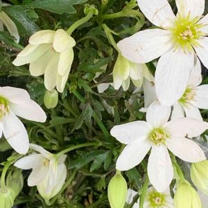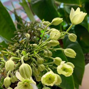 3月にお迎えしたクレマチス カートマニージョー🌿 沢山咲いていた花はあっという間になくなり、まー来年また見られるかな?くらいに思っていたのですが、5月から次々と蕾が出始め、この様な房が6個✨ サプライズの気分です💕 🏷に『天使のすず』ともあるので、咲ききらない蕾の姿も可愛らしく、薄いグリーンがとても素敵✨✨ 旧枝咲きなので、今年伸びた枝🌿は来年の為、大切にします😌