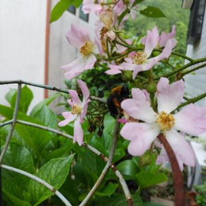 水曜ローズショーに参加します😊 今、うちのバラは他に4種類が咲いていますが このバラにだけ”くまんばち”がやってきます♥ 優しいというか柔らかいというかそんな甘い香りがします💛 今年もきたぁーーー😊😄 黄色のチョッキ姿が可愛い😊😄 スマホでパシャリパシャリしていても花から花へと忙しげです💛
