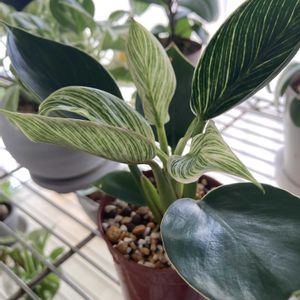①〰️③ フィロデンドロン バーキン。 DAISO産 1年くらい前かなぁ、 3株入って500円だった、バーキンさんは なかなか いい斑が入ってこなくて うーん🤔と思ってたけど このところ、【おばけ👻】と呼ばれるマシロな葉っぱがたくさん出てきた。そしていい感じに葉脈が出てきている。ミャクミャク。 おばけは 光合成がしにくいだろうから ベランダの半日陰に出して 様子見して行こうᐩᕀ