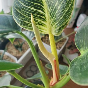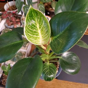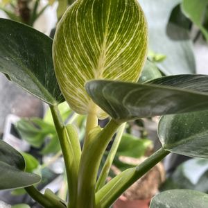 2024年8月に100均で買ったフィロデンドロン バーキン 新しい葉っぱが出てきそう。 この前やっと白色の葉っぱが出てきたが、今回も白い葉が出てくる予感✨