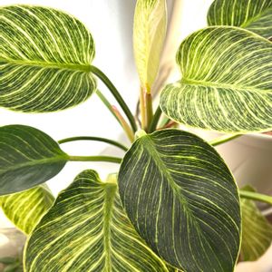 アンスリウム クラリネルビウム 新しい葉っぱが大きくなってきました✨ 他の葉より葉脈がくっきり😆 2:フィロデンドロン バーキン こちらも新しい葉っぱがなかなか綺麗な気がする🥰 3、4:引きで見るとこんな感じ🤣 2024年の徒長オブ・ザ・イヤーに堂々のノミネート🏆️ 完全に仕立て直しのタイミングを逃し春待ち中です🌸