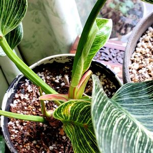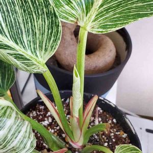 成長期到来 新芽がクルクル出てきます ツヤ艶です カラテアと間違えて購入し返品しようとしましたが、GSの方にこれも何かの縁…と諭され今に至ります。 毎日観てると情が移ります。