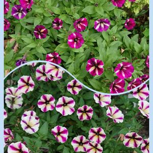 スーパーチュニア 『ラズベリーチーズ』✨ 何度か切り戻した今日のお花💖 & 下は育て始めの6月のpic💗 ラズベリーが濃くなっています🎵
