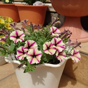 今日のお花 ❀ペチュニア❀ 我が家のクッキー鉢に植えた スーパーチュニアさんをアップします💕 ガッツリ切り戻してから 現在2回目?3回目?の満開に向けて準備中 満開まであとひと息( ´ ▽ ` )ノ ラズベリーチーズの色合いがハッキリと出て にじむ……… と言うよりは ハッキリとコントラストしてますね💕