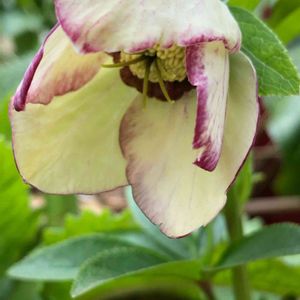 クリスマスローズ⑥ 先日の開きかけからさらに開いてこのお顔です✨ 超多弁ではないけれど花びらひらひらで可愛いです💜 dd ホワイトピコ