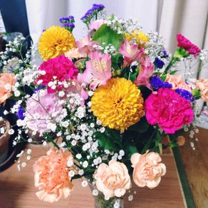 5月最初の投稿は 母の日、いろいろなカーネーションが入ったうれしい💓花束💐 息子より。 カーネーションの他はピンポンマム💛、スターチス💜、アルストロメリア🩷、かすみ草🤍、ドラセナ💚 又明日から頑張りましょ🤗