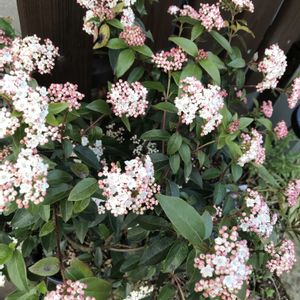 今年の3月2日に、ミニ花壇用に花苗など買った時に買っていた、ビバーナム イブプライスです😊 買った頃は、まだ蕾でしたが、先週辺りから花が咲いてきました😍 でも先週の雨風で少し散ってます😢