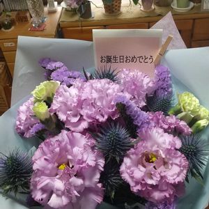 娘から届いた、誕生日祝いの花束💐 好きな紫がメインカラーの、嬉しいプレゼント🎀