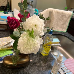 こんにちは。 我が家のグリーンを使って、アレンジしました。 お花は、いつもの朝市で、お安く買えました🎵