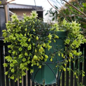 こんばんは😊 2年目の『クレマチス ペトリエイ』が咲きました✨ 一緒に植わっている『アロマティカス』がもりもりすぎるのか…花数は少ないです😅 実は寄せ植えにしたのではなく… 空いてるところにアロマティカスを挿しておいただけなんですが😅 お花の培養土だと大きくなるのが早いです😆 お花が終わったら、お一人様に植え替える予定です😊