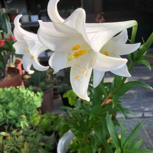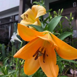 ユリ第7弾、テッポウユリの黄色が咲きました。大きい花です。残念ながら2輪だけです。