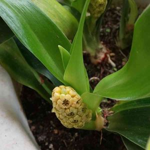 万年青の花? 何年か前に生け花のお稽古で使ったものが花をつけました! 枯れ葉にまぎれてて全然気づかなかった😅 これがあの赤い実になるのね🎵