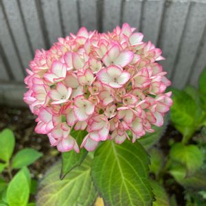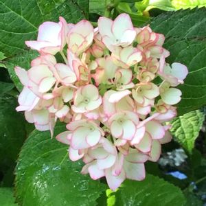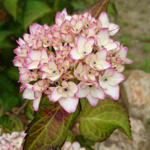 ハイドランジア 未来 赤い葉っぱの子 咲き始めはピンクの縁取り 先進むと全体が淡いピンクに染まり😊💕