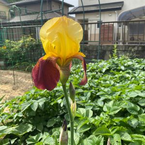 おはようございます。 ジャーマンアイリスが咲き出しましたよ〜。 でも、鉢植えだった株は今のところ次のサーモンピンクっぽいのが1輪だけ。 こないだオカンが地に落としていました。