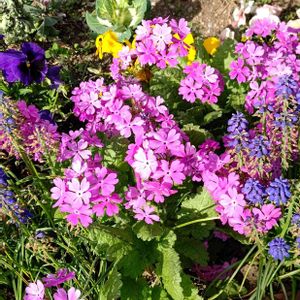 雨で倒れていたサクラソウが お天気になって また上を向いてくれました🎶 ムスカリさんはそろそろ 来年の為に刈りとってしまったほうがいいかしら