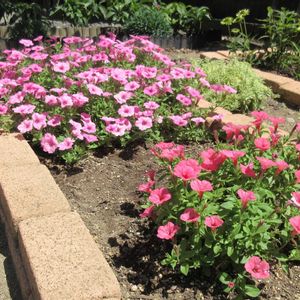 こんにちは♪ スーパーチュニアビスタ花壇。 ピンクとシルキーピンク。 シルキーピンクは鉢植えを地植えにしました。 心配でしたが、根付いたようです。