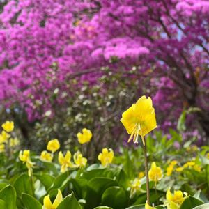 黄花カタクリ、今が咲き始め。 後ろの木はミツバツツジ。 可愛いな。