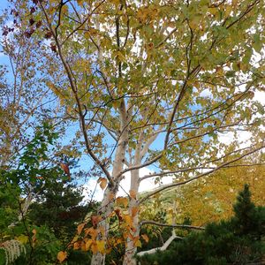 ダケカンバの白い幹と紅葉、緑、さらに空の青 コントラストが美しい季節。もう少しすれば、北アルプスは冬景色。雷鳥さんも冬毛にかわり始めていました @八方尾根