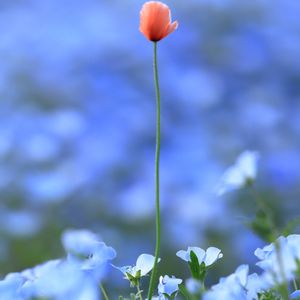 青いネモフィラの海に、一輪咲く赤いポピー。 ポピーの花言葉は「いたわり」「思いやり」「恋の予感」「陽気で優しい」だそうです。 「いたわり」や「思いやり」などは、大切にしたいですね(^_^)