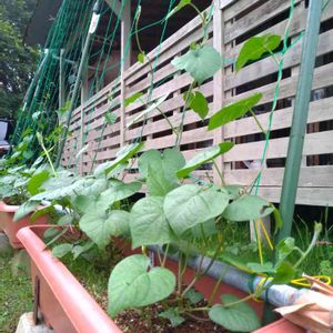デッキにいつもならオーニングを取り付けて日除けするのですが、今年は朝顔で緑のカーテンに挑戦しています🙋 種はダイソー産です。 早く伸びてくれないと梅雨があけちゃうよーーー!!!