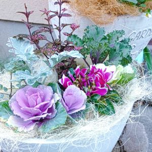 玄関前の寄せ植えです🙌 色違いのココヤシファイバー入れて、植物たちにも冬支度してみました☃