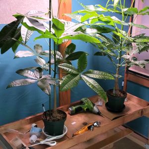 今日は8日パキラの日です。11日あたりに7号鉢から9号鉢に鉢増しする予定です。私は剪定が嫌いなので、今のままだと天井にぶつかります。これで2年生なんですよね。2体とも同じように成長しているということは、個体差ではなく、環境によるものだと特定できますね。
