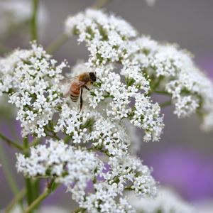来客あり^^ バレリアナ*オフィキナリスにハチが来ていました。 和名はセイヨウカノコソウ。 スーッと伸びた茎の先に、このような細かい花を咲かせます^^
