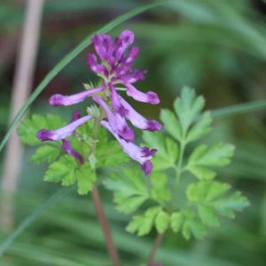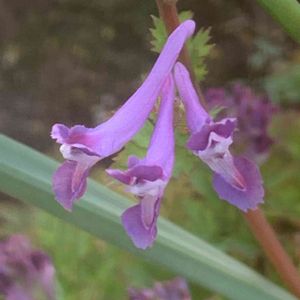 野に咲く花 花の後方に蜜が入った 長い「距」と呼ばれる 部分が突き出し〰︎ 前方には 上下に 紅紫色の唇形の花びら🎶 花は積み重なるように咲く 紫華鬘(むらさきけまん) ケシ科