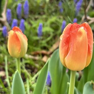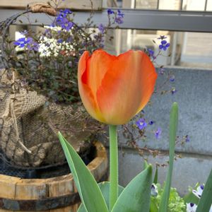 昨年春(4/10)のpicより… チューリップ プリンスクラウス🌷… 黄色っぽい蕾💛からオレンジ🧡、そして最後は赤❤️に色変わりしたチューリップです🌷 (種まきネモフィラと球根のコラボ鉢より)