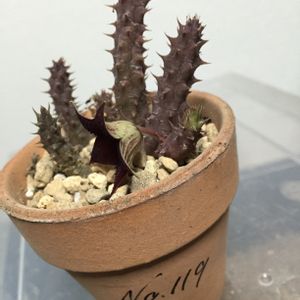 こちらもラベル違いで、付いてたラベルはHuernia hystrix だったけど、全然違う花が咲きました。どうやら国内流通名『黄蛾角』と呼ばれているもののようです。 なんで黄蛾角なのか?『蛾角』という、こちらは正真正銘黄色い花が咲くフェルニアもありますが、そちらと名前を入れ換えた方がいいんじゃないのか?そもそも入れ違っちゃってたりするんじゃないのか?とも思いますが、どうなんでしょう。名前の由来がわからないのでわかりませけど。 ところで黄蛾角で検索して出てきたサイトを色々見ても、植物名(学名)が併記されているサイトが見つかりません。 仕方がないので、海外のサイトでよく似たフェルニアを色々見比べたら、どうやらHuernia schneiderianaのようです。植物園や博物館に所蔵されている…きちんと同定された標本の特徴とも一致するので間違いなさそうです。 黄蛾角 Huernia schneideriana A.Berger (1913) タンザニア原産