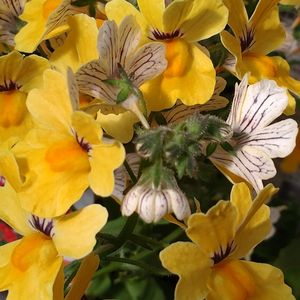 サンサシアプラス リトルバナナ (ゴマノハグサ科ネメシア属) 南アフリカ原産 開花期 春と秋 色鮮やかな一年草のネメシアと宿根草ネメシアのハイブリッドとして改良された人気のバイカラーシリーズ 一年草ネメシアの発色の良さや花つきの良さをそのままに 最低温度がマイナス5℃まで耐えられるように改良されたハイブリッドネメシアです 花びらの表側は元気の出る鮮やかな黄色💛 うらがわは赤紫色の花脈があり 風に揺れるとそれが見え隠れしてとても美しいです