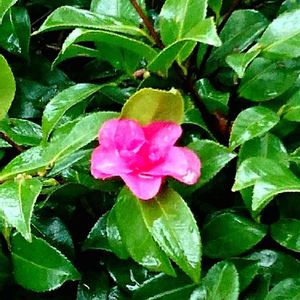 【仙台】 令和時代の幕開けの日、出勤途中で出会ったお花です! 雨の中、一輪だけ咲いていました。 濡れて濃く見え、輝く緑の葉っぱを背景に、とてもきれいだと感じ、📷! 葉っぱの感じからツツジではないでしょう。 さつきかなぁ? この葉っぱ、何だろう? 椿じゃないよなぁ? と考えて、調べてみても、自信がありませんので、お尋ねすることにしました。 よろしくお願いします。