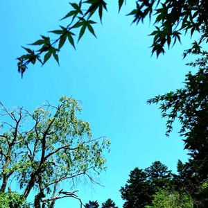 【仙台】 東北大学植物園での 青空と木々 雲一つないとてもきれいな青空でした。 青空を背景に、風になびく青もみじをうまく撮ることができました。 (令和元年5月12日撮影)