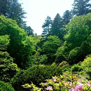 【仙台】 東北大学植物園での ツツジと奥深い木々 太陽に照らされて、様々な緑色が輝いていました。 奥に向かって深い山が広がっています。 いくつもの登り、下りの山道コースがあり、鳥が鳴き、沢があって、不気味な!?カエルの鳴き声が聞こえる、自然豊かな植物園です。 (令和元年5月12日撮影。きれいな青空でしたが、採光の調節がうまくいかず、空が白くなってしまい、残念です😖)