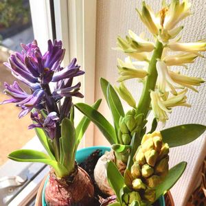 鉢植えの三色ヒヤシンス 窓辺に降り注ぐ春の陽射しにお目覚め✨ 静かに花を開き始めました
