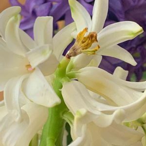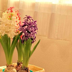暖かな部屋でヒヤシンス2色が あっという間に満開です✨ あとはピンク色の子の開花待ち🌸 どこにでも待ち合わせ時間に遅れる子って いますよね😉