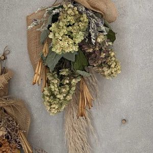 次女がお産に向けて 里帰りしました🤰 それまでお世話になっていた方 (飲食店のオーナーさんご夫婦)に 何かお礼を・・と思っていたら 娘がドライを希望きてくれたので ・・おこがましいと思いつつも・・ スワッグを作って もらっていただきました💐 ・カシワバアジサイ ・ユリの実 ・パンパスグラス ・ライスフラワー