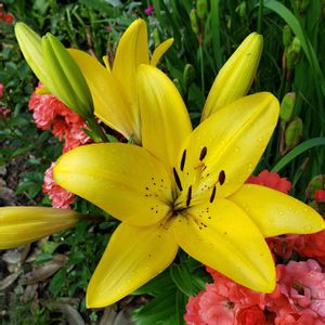 💛ユリ💛 種類を調べたらどうやらコンカドールという名前らしい❣️ 地植えは球根はそのままでも毎年楽しめるそうです。 ここは近所の方のお庭、年々増えていってます。 高さも150cm以上になるほど大きくて華やかなユリでした(*^^*) ピンクカサブランカと同じく名前が覚えやすいようにイエローカサブランカと呼ばれているみたい😢