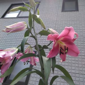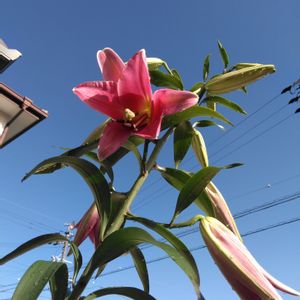 2メートルくらいに成長したユリ やっと咲きました。青空の元 ピンクが 映えます!