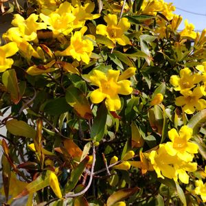 曇りがちの朝です。 我が家の庭も色とりどりになりました。 【カロライナジャスミン、庭桜、シロヤマブキ】