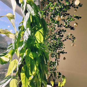 長くなりすぎて居場所がなくなり、水遣りがんばるって決めて天井ハンギングにしました。とは言っても高い位置のグリーンの水遣りは週末のみ。 足りないのか?💦真下すんごいことになってますけど😅