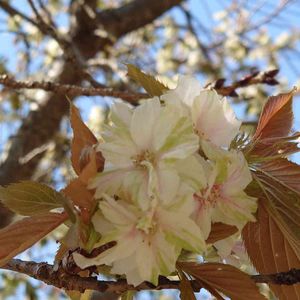 こんにちは 職場近くの鬱金桜🌸💚 金曜日には満開でしたが、手のひら届かない大木になり、下枝は枯れてきて、木の下部分には花はなし。 持ち主に許可を得て真下まで行き写真を撮りましたが、こんな感じにしか撮れませんでした。 この桜の元には超特大のブルーベリーの木もあるんです。 畑の端にたくさんの花木を植えられていて、私は毎日昼休みの散歩で楽しんでいます。 感謝です❤️