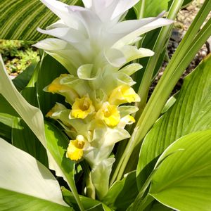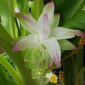 ウコンの根を埋めてみたら今年ワサワサ大きな葉が育ち花も咲きました。初めて見るウコンの花❣️