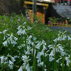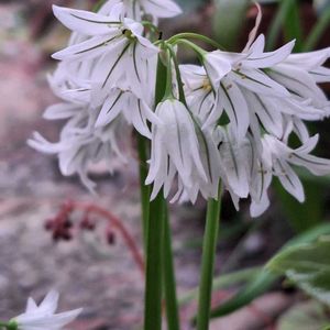 こんばんは~😃🌃 アリウムトリケトラム (三角葱(ミツカドネギ)) 御近所様のお庭で見つけました💚🤍 葱、ニラの仲間 ベル状の小さな白い花 多年草 花茎の断面が三角形▲が名前の由来 日陰が似合うお花かな~♪